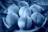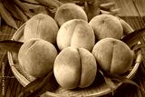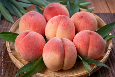 Peaches with leaves on the wooden table, Fresh Japan Peach wooden basket plate in wooden Background.