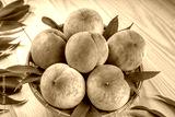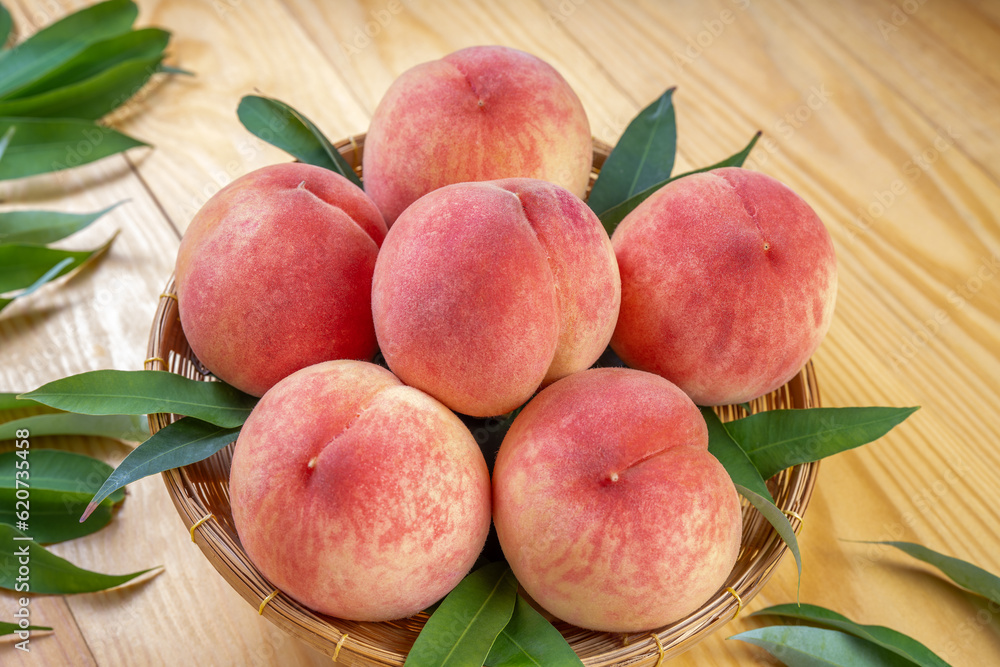 Peaches with leaves on the wooden table, Fresh Japan Peach wooden basket plate in wooden Background.