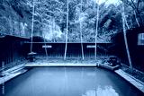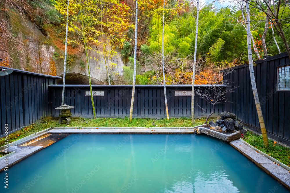 Kumamoto, Japan - Nov 22 2022: An open-air public bath surrounded by natural environment at Kurokawa Onsen, one of Japan's most attractive hot spring towns.