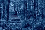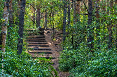 An old stone staircase in a green forest.