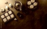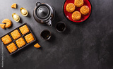 Chinese Mid-Autumn Festival concept made from mooncakes, tea and plum blossom. Chinese characters FU in the article refer to fortune good luck, wealth, money flow.