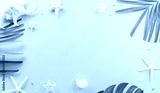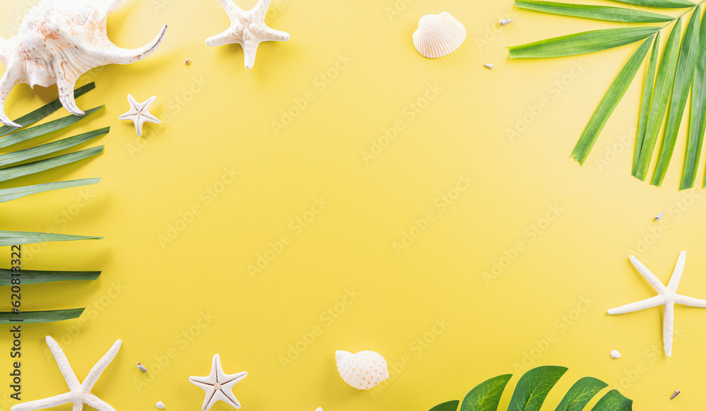 Summer composition concept made from starfish, sea shell and monstera leaf on pastel yellow background.