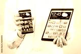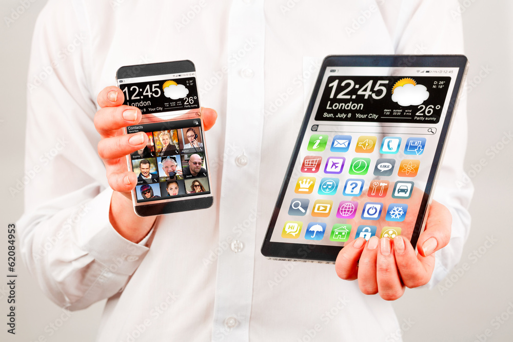 Smartphone and tablet with transparent screen in human hands.