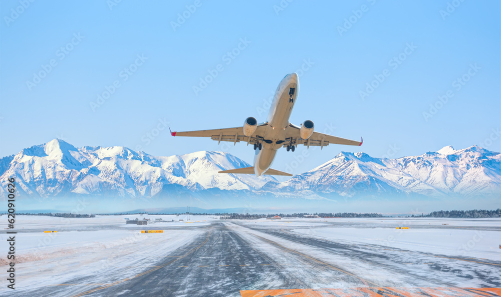 Commercical white airplane fly up over take-off runway the (ice) snow-covered airport- Norway