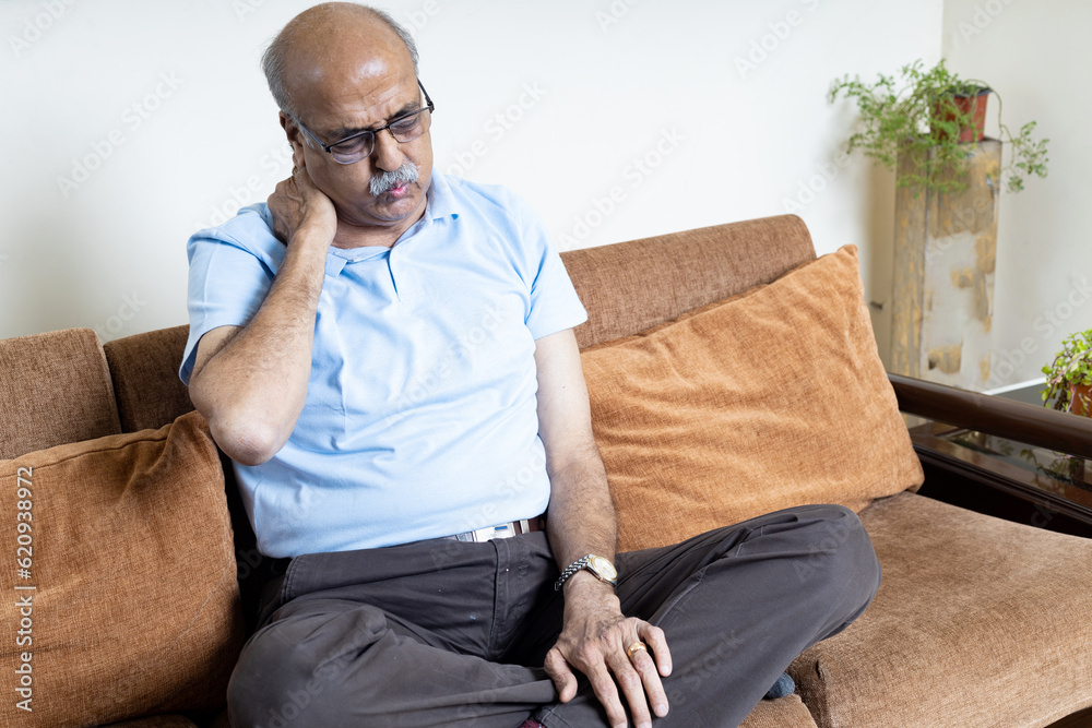 Asian senior man having neck pain, cervical spine sickness. old people with health problem