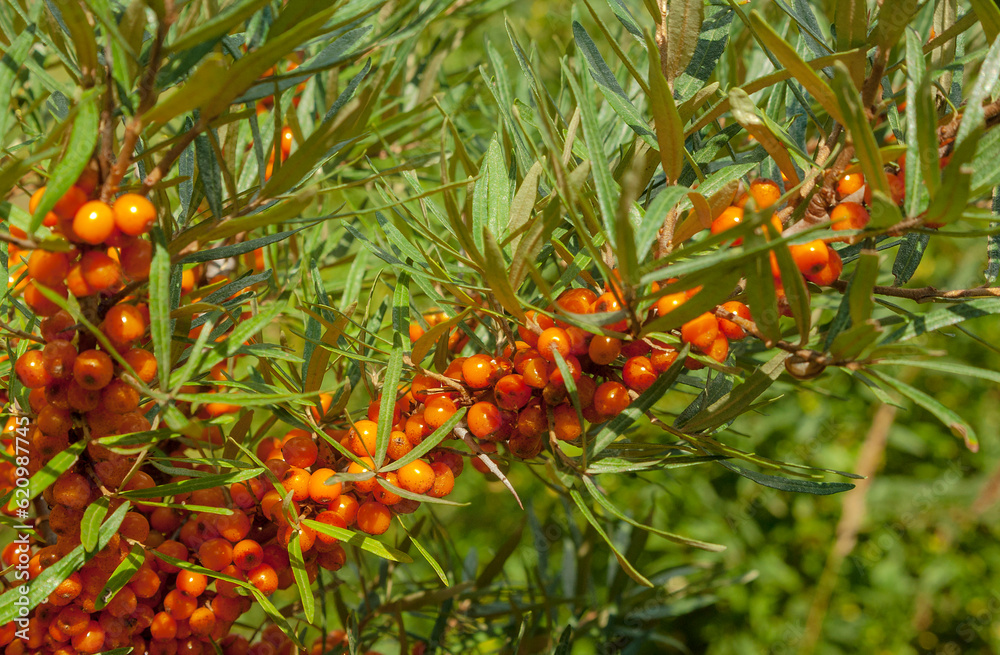 Pomarańczowe owoce ( jagody) rokitnika rośliny o właściwościach leczniczych.
