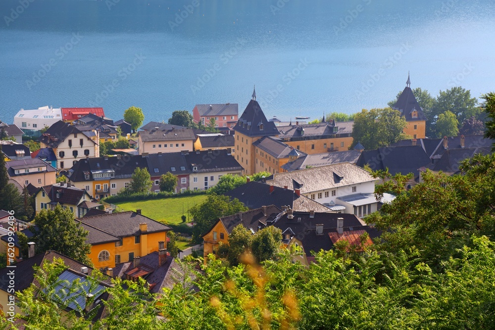 Millstatter See (Lake Millstatt) in Carinthia region of Austria. Alpine landscape with beautiful lake. Town of Millstatt am See.