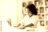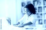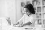 Child drawing rainbow. Paint on hands.