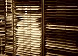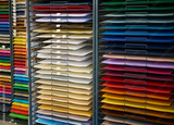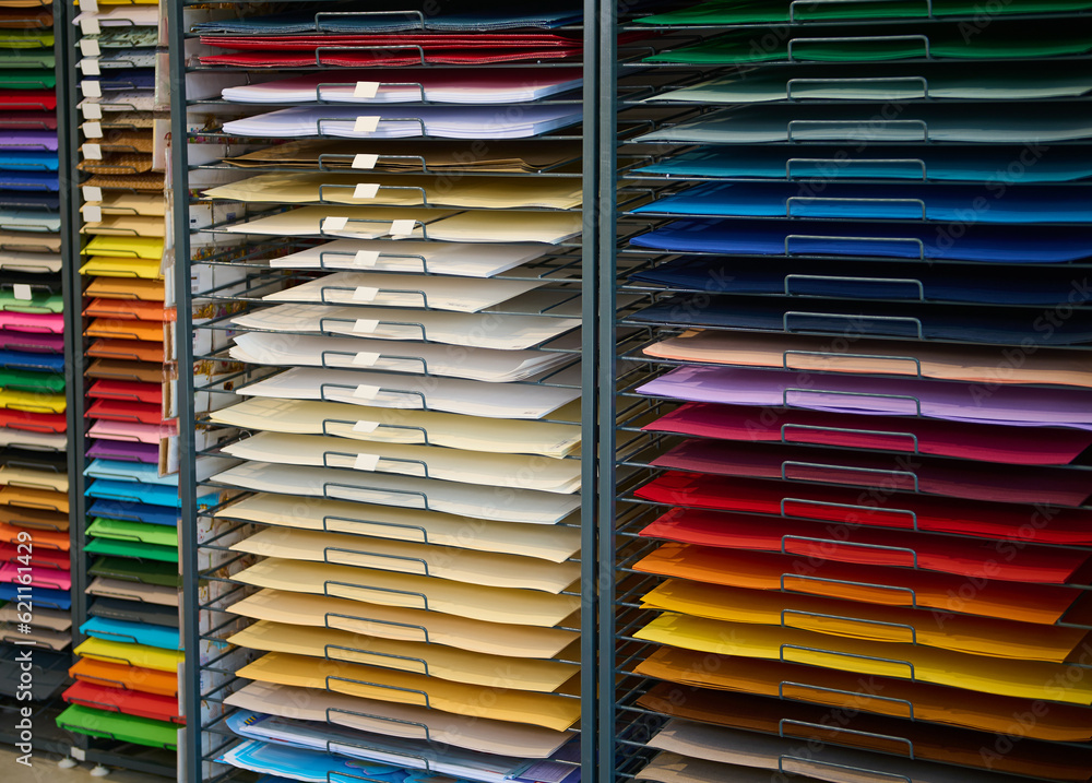 Stand with various color paper on shelves, for art, design, watercolor painting and pastel drawing, in stationery shop.