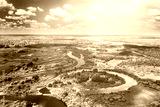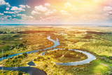 Aerial View Of Summer Curved River Landscape In Sunny Summer Day. Top View From High Attitude In Summer Season. Sunflare Sunbeam.