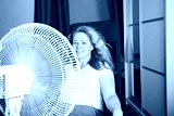 Woman blowing a fan to prevent sweating and stay comfortable in the heat, Preventing dehydration