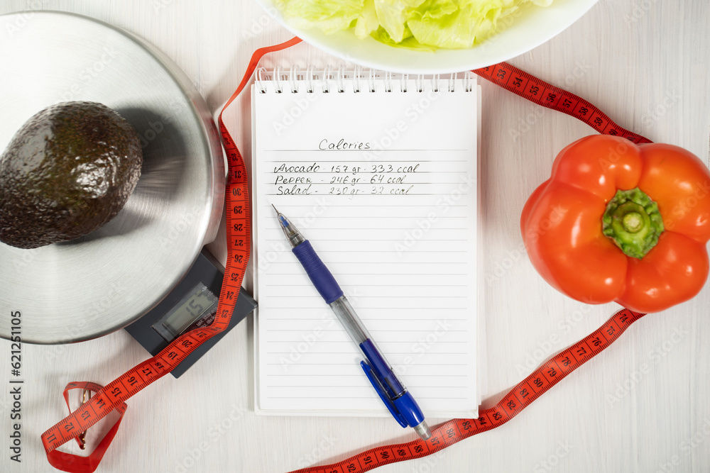 counting the calories of foods by their weight, writing in a notebook on salt with food on a kitchen scale, healthy eating, weight loss, bmi