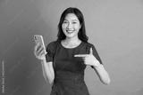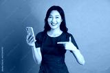 Portrait of beautiful woman in blue dress, isolated on blue background.