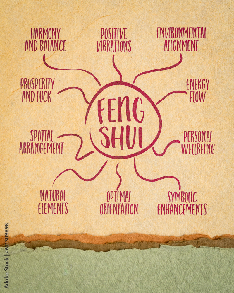 Feng shui infographics or mind map sketch, ancient Chinese philosophy and practice that seeks to harmonize individuals with their environment
