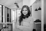 Portrait of beautiful smiling woman. Young student on yellow shirt with head phone standing in the reading room.