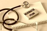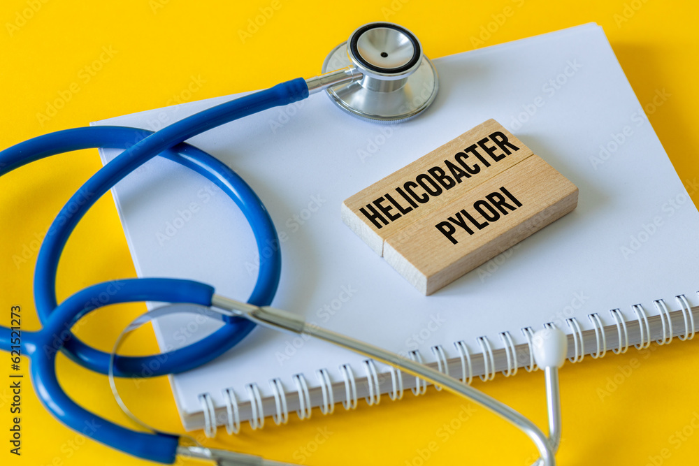 Medical stethoscope, notebook and inscription on wooden blocks Helicobacter Pylori, Bacteria multiplying in the stomach