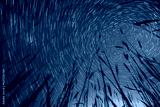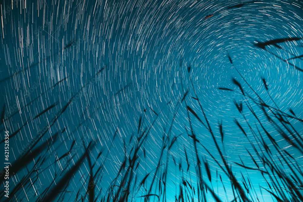 Spin Trails Of Stars Above Young Wheat Sprouts In Summer Agricultural Season. Night Starry Sky Glowing Milky Way Stars And Meteoric Track Trails Above Young Barley Sprouts Field. Rotate Sky Star