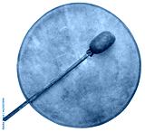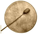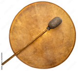 handmade, native American style, shaman frame drum covered by goat skin with a beater isolated on white