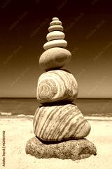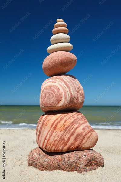 Rock zen pyramid of colorful pebbles on a background of blue sky