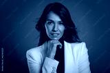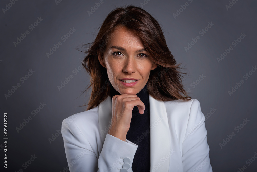 Clsoe-up of an attractive brunette haired woman wearing white blazer against isolated dark grey background