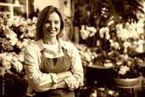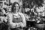 Woman florist small business owner standing with crossed arms near floral store. High quality photo