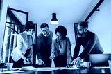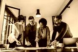 A interracial group of architects is pointing at the blueprints and having briefing about project they working on.