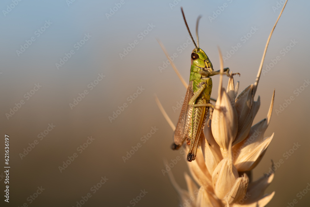 A small cricket, a common green grasshopper, sits on an ear of wheat in the evening sun. The sky is blue. There is a lot of space for text.