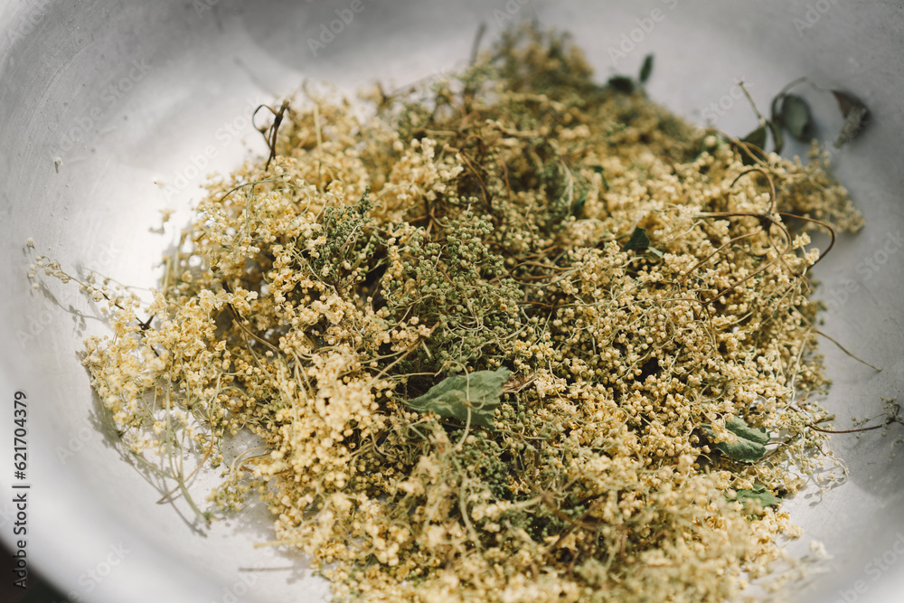 Clusters of dried flowers black elderberr. Sambucus nigra. Alternative medicine