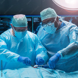 Team of medical doctors performs surgical operation in modern operating room using high-tech technology. Surgeons are working to save the patient in the hospital. Medicine, health and science.