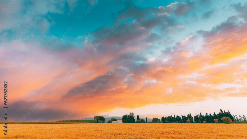 Catalonia, Spain. Summer Evening Sky Above Spanish Countryside Rural Wheat Field Landscape. Yellow Wheat At Sunset Catalonia, Spain. Summer Evening Sky Above Spanish Countryside Rural Wheat Field