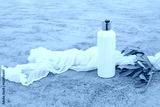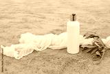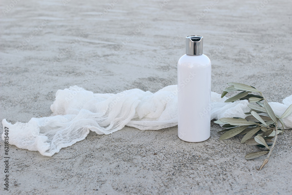 White cosmetic plastic bottle mockup with green olive tree branch and muslin veil. Natural liquid soap, shampoo or moisturizer. Grey grunge concrete floor background. Summer skin care, cosmetology.
