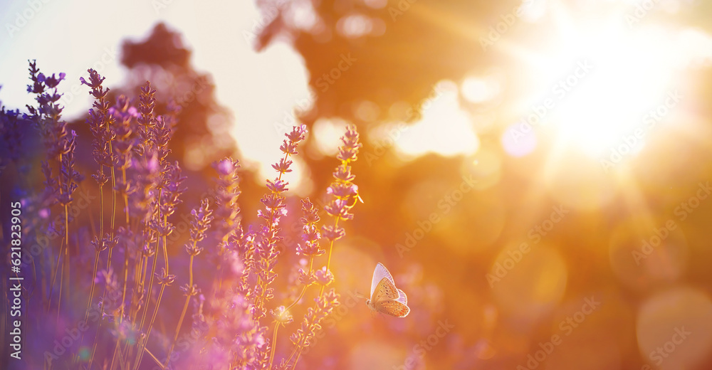 art Beautiful summer sunset background with blooming wild lovanda flowers and flying butterflies in a sunny meadow