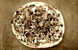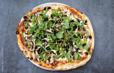 Traditional vegetable pizza with arugula on rustic table. top view.