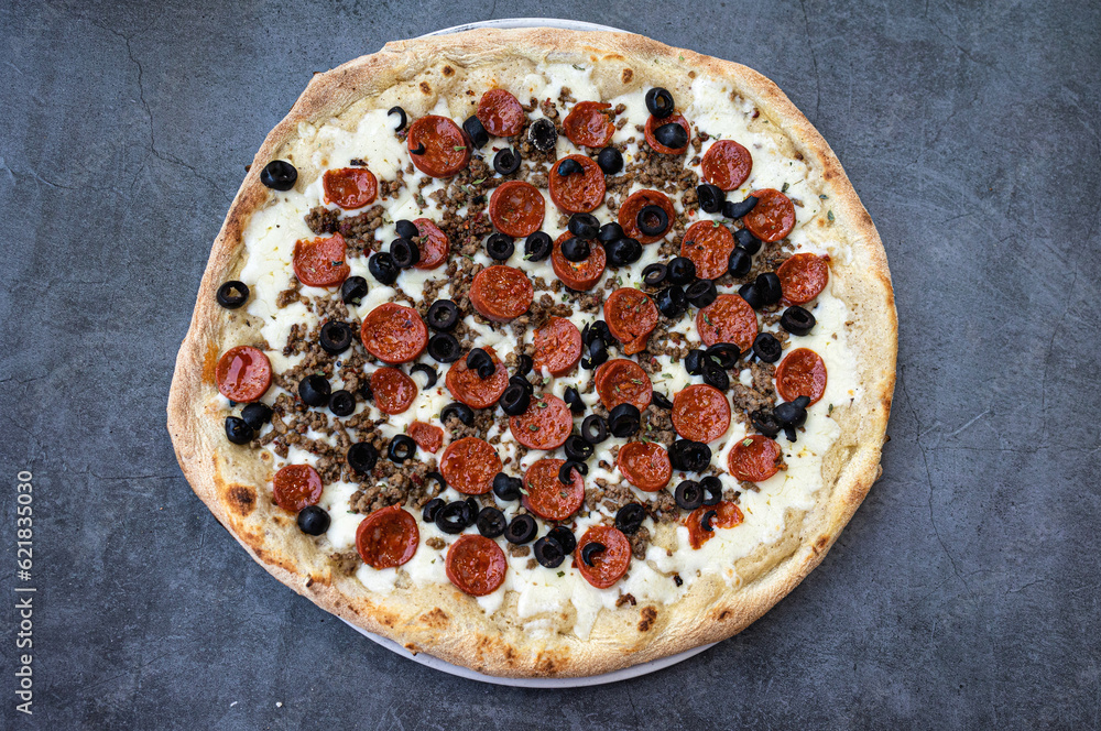 Delicious pepperoni pizza with bechamel and beef on rustic table. top view.