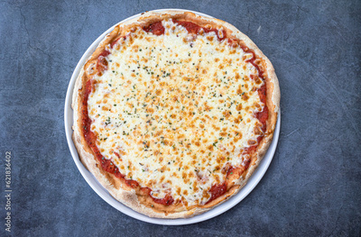 Italian pizza Margherita with cheese and tomato sauce on the rustic table.Top viewv