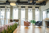 cozy waiting lounge with large windows, soft and comfortable armchairs, green and natural plants in modern coworking environment, workspace organization concept