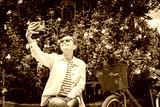 Attractive happy senior woman taking selfie using smartphone in the summer city, bike standing nearby