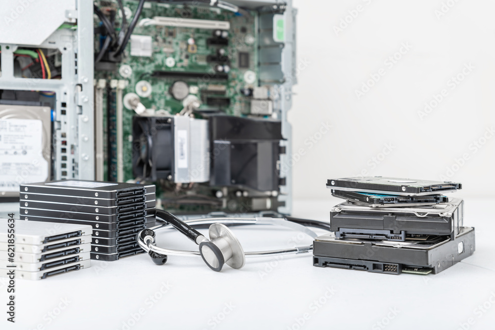 Close-up view of hard disk drives with a PC in the background. Upgrade, repair and data recovery concept
