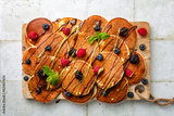 Pancakes board with chocolate and pistachio topping and fresh berries, blueberry, raspberry, boysenberry on a wooden board and white table surface. Directly above, top view.