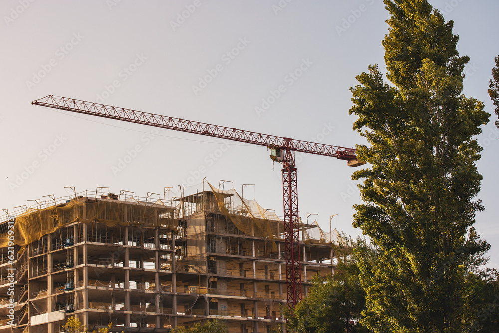 Construction of a residential high-rise multistory modern house building in a metropolis city. Construction crane on horizon. Buildings under construction against sky. Housing business. New flats home