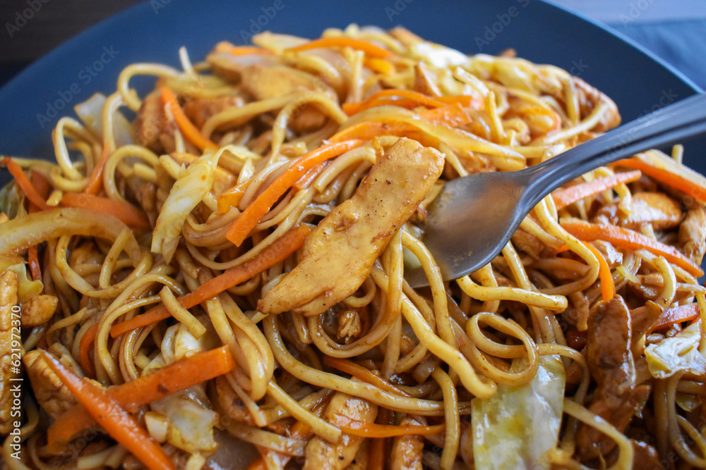 Chicken chow mein on fork on a plate. Traditional Chinese stir fry noodles.