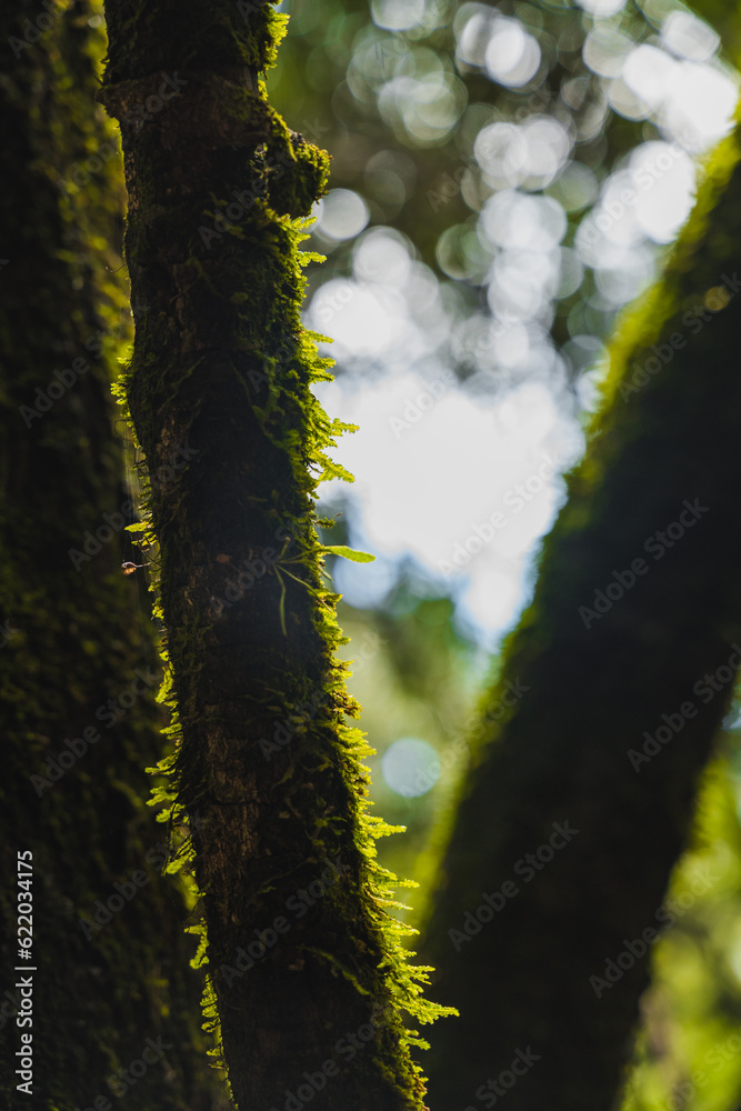 Trees with moss in the middle of the forest, the mist generates mysticism, the rays of light enter between the branches.