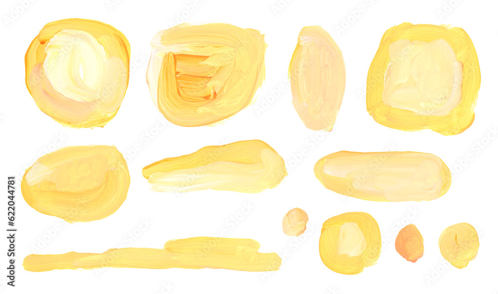 Art oil and acrylic smear blot dot painting elements. Abstract yellow color hand drawn stain brushstroke texture on white background.