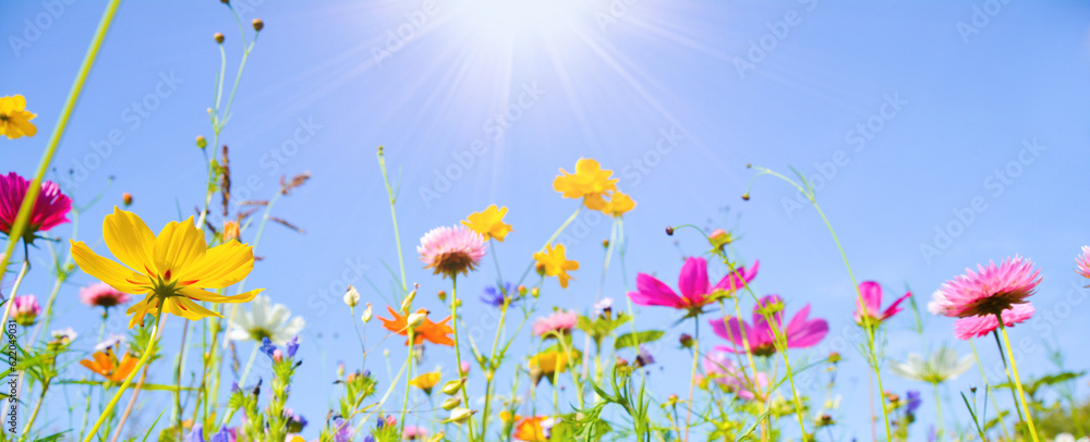 Beautiful flower meadow with wildflowers in the sun and blue sky - A glorious day