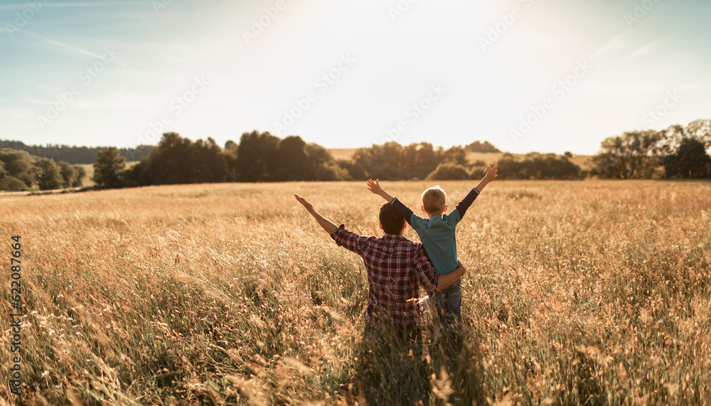 Joyful father son bonding amidst wheat field, arms raised, connecting with nature, under sunny sky.