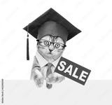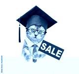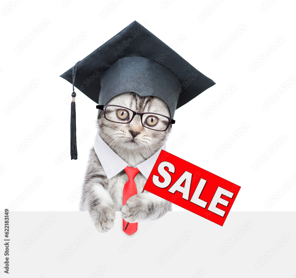 Happy graduated cat wearing eyeglasses and necktie looks above empty white banner and holds signboard with labeled "sale". isolated on white background