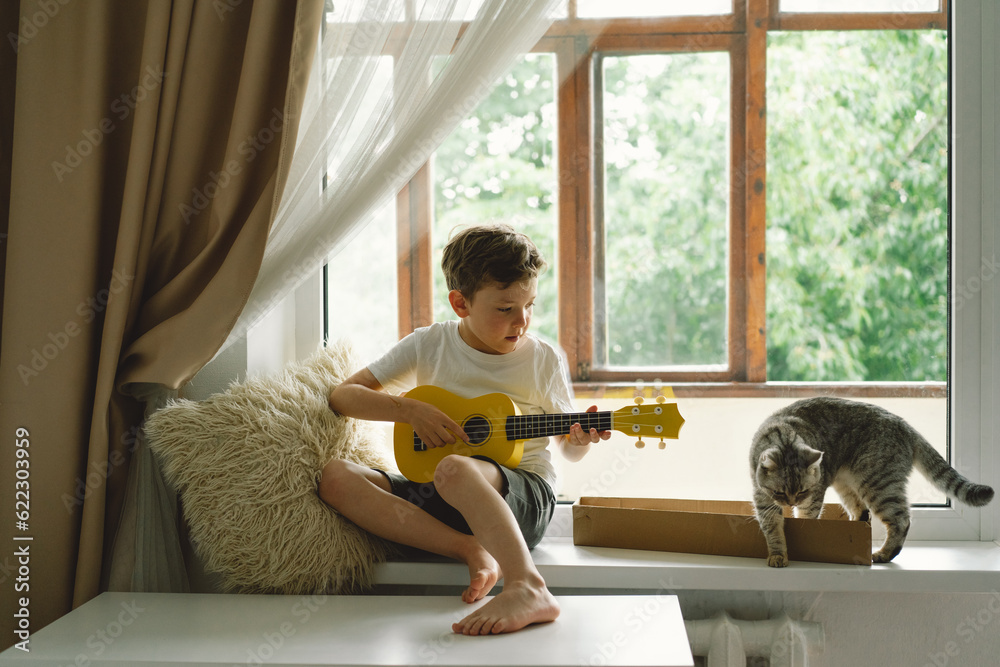 Cute boy learns to play the Ukulele guitar on the windowsill near the window with cat . Cozy home. Summer holidays lifestyle.