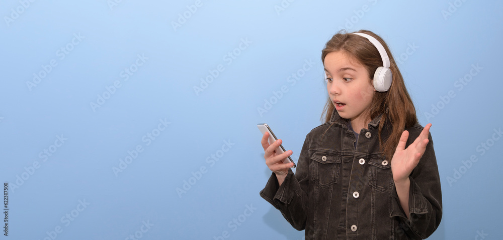 Banner of a teenager receives a message on a smartphone through a messenger application. A pleasant message unexpectedly arrived. Light blue background