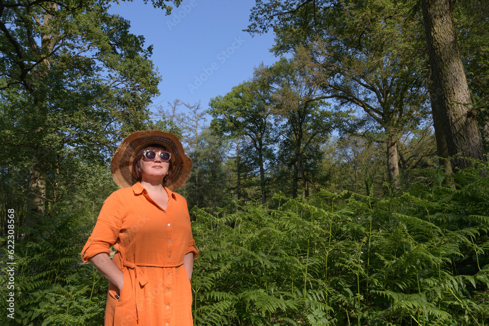 A middle-aged woman in a summer park. Orange dress, sunglasses and straw hat