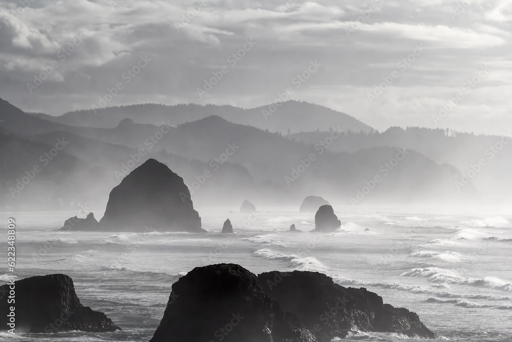 Cannon Beach along Oregon Coast on a Foggy Day Black and White Portrait